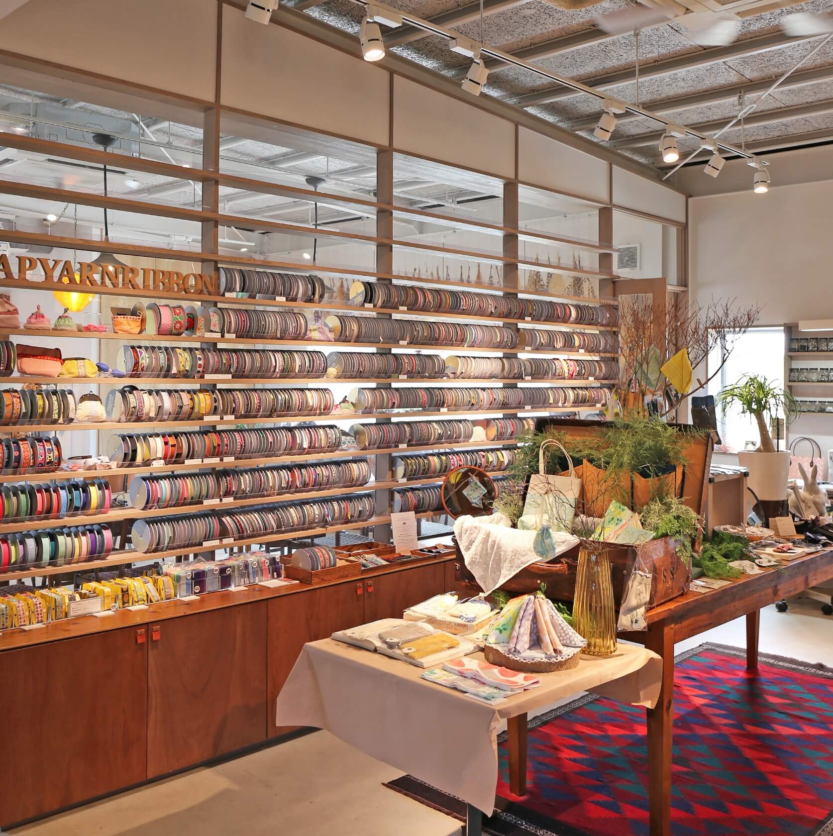 壁一面に並ぶ約800種類の可愛いチロルリボンやハンドメイド作家様の作品、セレクトした小物雑貨などを販売しております。併設のミシンスペースにはフリープランと有料のサポートプランをご用意しており、その場ですぐに作品づくりを楽しんでいただけます。手芸用リボンの生産が盛んな福井県坂井市丸岡町に訪れたらぜひお越しください。